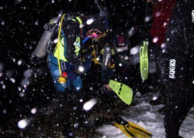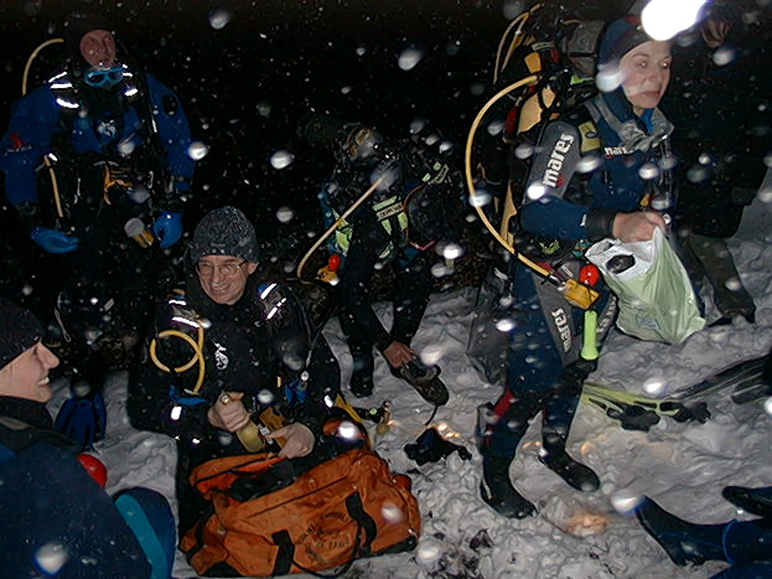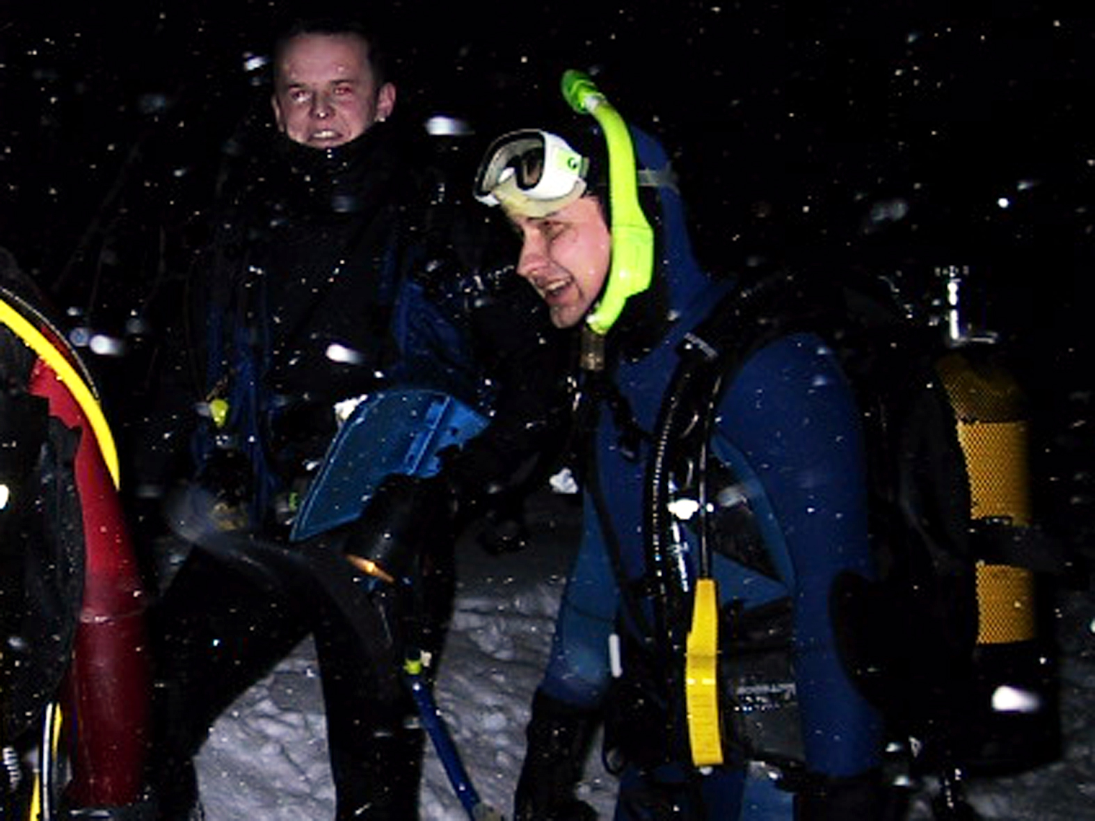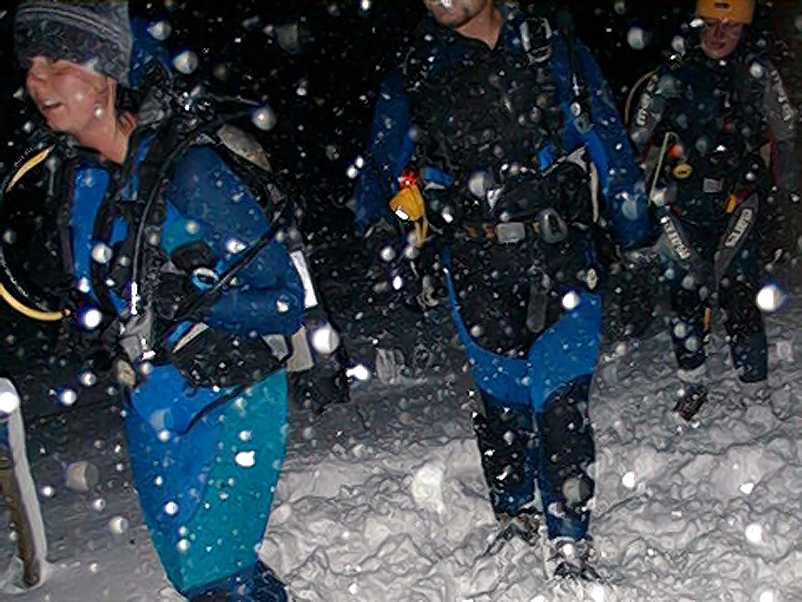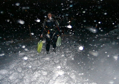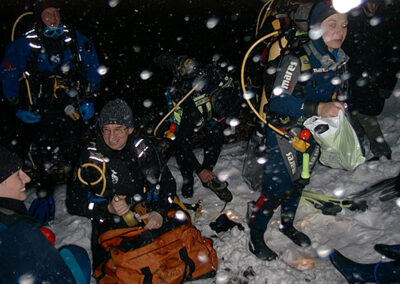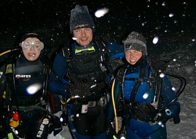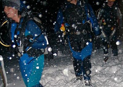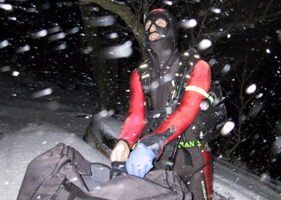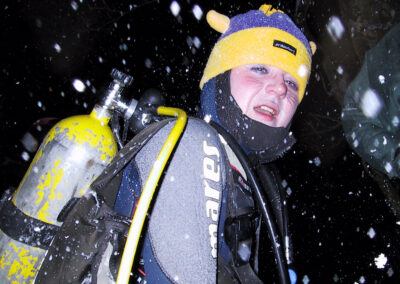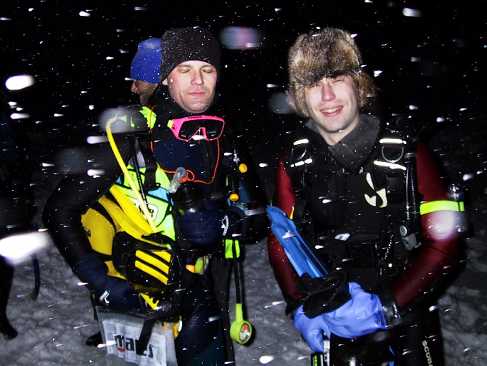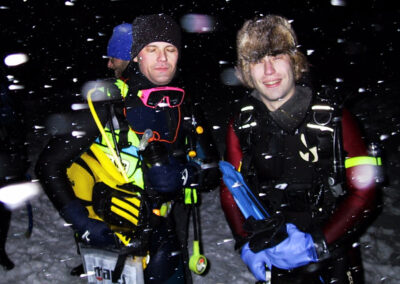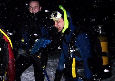 Plan był taki: jedziemy na Sylwestra nad Hańczę do Słowika, przed godziną dwunastą zakładamy sprzęt i zanurzamy się pod wodę na pierwszym parkingu. O północy pod wodą otwieramy butelki szampana i wznosimy toast. Wychodzimy z wody w już dwudziestym pierwszym wieku. Na Sylwestra zjawił się tłum klubowiczów, zatem ustaliliśmy, że pod wodę schodzimy parami, a każda para ma swoja butelkę szampana. Wszystko poszło zgodnie z planem, nie przeszkadzał nam nawet śnieg, który zaczął obficie sypać. Nad wodę nie dało się dojechać, więc poszliśmy ubrani w pianki z butlami na piechotę. Samo nurkowanie było magiczne i nie da się go opisać. Natomiast w drodze powrotnej z nurkowania okazało się, że dróg już nie ma. Z trudem, po pas w śniegu dotarliśmy do Słowika. Następnego dnia mieliśmy wyjeżdżać do Warszawy. Po odkopaniu samochodów, traktor przeciągał każdy samochód osobno przez Błaskowiznę. Później czekaliśmy na pługi i tak, odcinek po odcinku, posuwaliśmy się do przodu. Do Jeleniewa dotarliśmy po siedmiu godzinach. Od Suwałk do Warszawy nie było już grama śniegu.